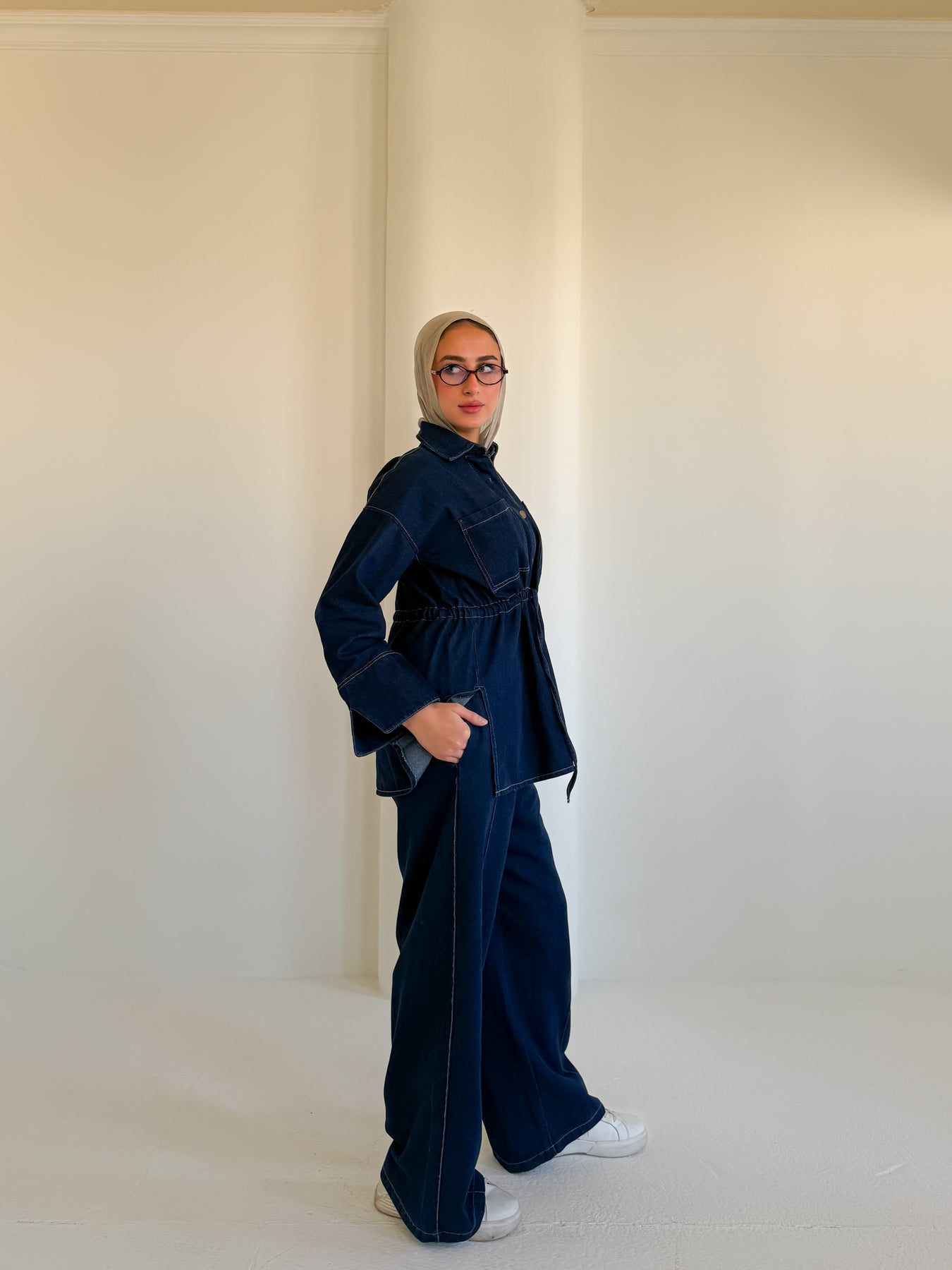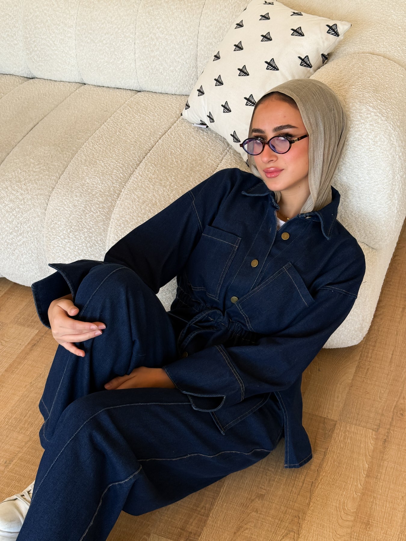 Denim kind of day 💙✨ Keeping it simple and classy in a dark denim set with white sneakers for a clean, comfy vibe. Chilling, sipping coffee, and enjoying the calm mood — a good day ahead for sure ☕🌿